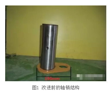由故障排查結果可知,我公司自製軸銷存在2個問題:一是軸銷出油孔軸向位置不確定(dìng),不(bú)能保證處於(yú)與(yǔ)軸套油(yóu)道相對應的位(wèi)置;二是軸銷出油孔徑向(xiàng)位置不確定,容易(yì)使出油孔處於軸銷受力(lì)位置,造成出油孔不(bú)能排出潤滑脂,導(dǎo)致(zhì)軸銷和(hé)軸套得不到有(yǒu)效潤滑而加快磨損。改進(jìn)前的軸銷結構如圖(tú)1所示。