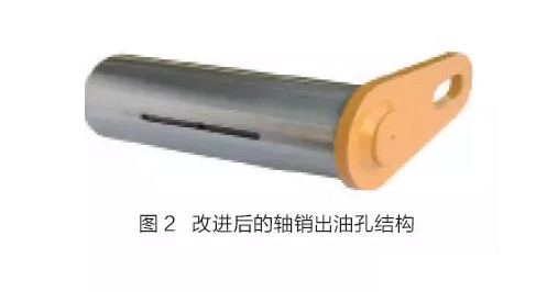 經研究,我們提出以下6項改進方案:一是采購或加工軸銷(xiāo)的尺寸要標(biāo)準,其出(chū)油孔位置要與軸套上的油槽相吻合;二是選用優質(zhì)材料(如(rú)40cr鋼)加工軸銷;三是將軸銷圓形出油孔改進為長槽形出(chū)油孔,且將長槽形出油孔設置在軸銷受力部位的另(lìng)一側,以減少軸銷堵塞(sāi)概率;四是選用淬硬層較厚的軸銷,以提高其耐磨性能;五(wǔ)是對更換下來磨損不嚴重的軸銷采用電刷鍍等方法進行修複(fù),以(yǐ)降低維修成(chéng)本。六是配件庫房將庫存的不(bú)同部(bù)位的軸銷標注其(qí)具體名(míng)稱和尺寸,以(yǐ)免錯裝。改進後的軸銷結(jié)構如圖2圖所示。