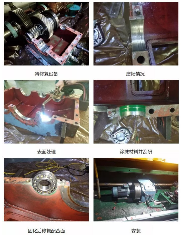 某輪胎廠車間鋼絲(sī)簾布裁斷機齒輪箱軸承室出現磨損問題,嚴重位置單邊磨損量約(yuē)1mm。若不及(jí)時處理將導(dǎo)致軸承跑外(wài)圈,設備運轉異響且跳動(dòng)擺動嚴重等(děng)現象,並嚴(yán)重影響設備運行平穩性及產品質量,嚴重(chóng)的(de)會造成軸承的損壞導致設(shè)備停機停產,給生產型企業帶來很大困擾。