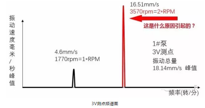 振動實測表明:3V和4V測點振動Z大(dà)。3V測點頻譜(pǔ)中,2*RPM頻率3570rpm分量的幅值達16.51mm/s峰值,而1*RPM頻率分量的幅(fú)值僅為4.60mm/s峰值(zhí)。注意:該葉輪的葉片數為2片,葉片通過頻率BPF=2*RPM。