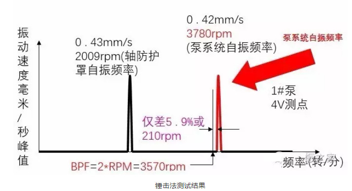 用錘擊法(fǎ)測試電動機,軸(zhóu)和泵的自振頻率(lǜ)。4V測點(diǎn)的自振頻率測試頻譜表明:占優勢的自振頻率3780rpm,它與運行中測到的頻譜的Z大振動頻率分量3570rpm=2*RPM=BPF泵葉輪的葉(yè)片通過頻率(BPF)僅差210rpm或5.9%。此外,還有2009rpm軸防護罩自振頻率。由於自振頻率3780rpm太靠近泵葉輪的葉片通過頻率或泵轉速的二倍頻率3570rpm,極易(yì)激起泵係統共振(zhèn)。因此,試驗用加(jiā)固泵係統支承剛度,改變係統自振頻率(“調頻”),以避免發生共(gòng)振。