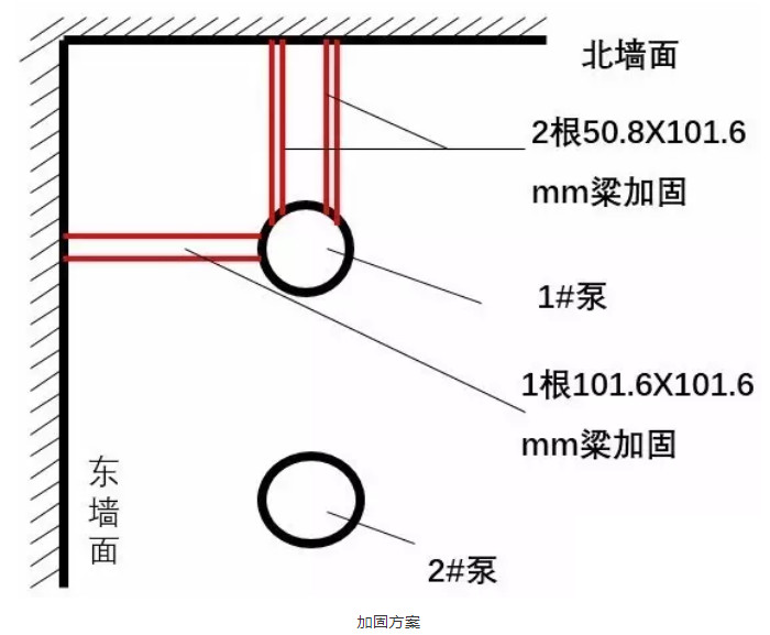 對1#泵加(jiā)輔助支撐,改變其自振頻率。加固(gù)方案如(rú)圖: