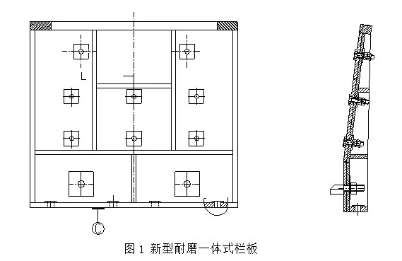 由於台車欄板變形造成的(de)欄(lán)板與台車體之間的縫隙所造成的漏風、上下欄板之間的漏風,蓖條銷子與台車欄板間隙配合所造成的(de)漏風,由於欄板結構、材質不合理出(chū)現的欄板裂縫造成的漏風,台車與台車之間由於欄板變形及在設計時台車體與欄板兩端(duān)各留(liú)有1mm的間隙,在欄板與台車體裝(zhuāng)置後產生2mm的間隙造成的台車與台車之間的漏風等(děng)。這些漏風影響很大,處理也極其(qí)困難(nán),約占總風量的30%左右。對漏風嚴重的台車欄板進行改造,發明一種新型欄板如(rú)圖1所示,新型燒結機台車欄板,欄板本體為一體式焊接結構(gòu),欄板(bǎn)本體上依次(cì)均布有若幹耐磨導熱襯板,且各耐磨導熱襯板(bǎn)通過緊固裝置與欄板本體相固(gù)定。工作過程中,一體式結(jié)構的(de)欄板本體能夠有效提高(gāo)整體結構密封(fēng)性,從而(ér)使得燒結機台車欄板的漏風率大大降低(dī),並顯著提高其整體結構可靠性;同時耐磨導(dǎo)熱襯板能夠進一步提高燒結(jié)機台車欄板(bǎn)的高溫(wēn)耐受性和耐(nài)磨損能力,有效避免因溫差過大而導致的(de)欄板本體結構變(biàn)形,從而使得燒結機台車欄板的整體結構更加穩定可靠。