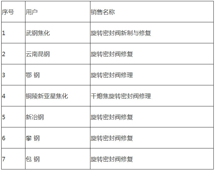 公司旋轉密封閥業績覆蓋的主要單位一覽表