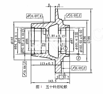 從圖1可知,外軸承孔對(duì)內軸承孔跳動小於0.06mm,外軸承(chéng)台(tái)肩麵對內(nèi)軸承孔台肩麵(miàn)平行度小於0.07mm。φ156mm凸(tū)台麵及其(qí)止口外圓對軸承孔跳動小於0.05mm。從工藝分析可知,一般工(gōng)藝都是精加工好(hǎo)外軸承孔、φ156mm凸台麵(miàn)及其(qí)止(zhǐ)口外圓,再以精加工好的(de)軸承孔及法蘭端麵定位,調頭精車(chē)另一端軸(zhóu)承孔及各孔、端麵。這種加工方法非常方便,對設備(bèi)精度要求不高,但調(diào)頭加工(gōng)兩軸承孔,要保(bǎo)證跳動小於0.06mm,是非常困難的。要設計製造出(chū)調頭加(jiā)工兩軸承孔並保證(zhèng)內軸承孔對外(wài)軸承孔跳動不大於0.06mm的夾具較困難(nán),影響我公司的生產效率。