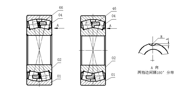 調心(xīn)滾子軸承常見的三種結構,其中有兩種結構如(rú)下(xià)圖所示,內圈02均帶小擋邊,分布於(yú)兩端麵,並且各有一裝滾子缺(quē)口(kǒu),間(jiān)隔180度,缺口的作(zuò)用是便於裝入合適的滾子04。此類結構的保持架46或66一般采用黃銅材(cái)料。完成裝配(pèi)成品後需檢查軸承(chéng)回轉靈活性,但轉動外圈01後發現有滾子從保持架中脫落,或在缺口處手稍加用力撥出,滾子(zǐ)沿缺(quē)口就脫離(lí)軸承。