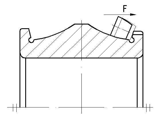軸承內圈車加工小(xiǎo)擋(dǎng)邊外徑按照(zhào)產品圖紙要求為“-”公差,通常為-0.35~-0.15mm,而設計(jì)的缺口的深度尺寸一般隻有基本尺寸(cùn),無公差。實際加工根據目前的機床精度公差控製在±0.2mm範圍之(zhī)內,而缺口深口尺寸(cùn)測(cè)量是以小擋(dǎng)邊的外(wài)徑基準(zhǔn)測量的(如下圖(tú)2)。油(yóu)溝的(de)深度尺寸公差根據目前(qián)加工行業標準(zhǔn)按±0.15mm控製,這樣對於深度(小擋邊外徑至油溝中心的距離)淺的小(xiǎo)擋邊,通(tōng)常深度尺寸不超過3mm,實際加工中有可能產生公差(chà)累積疊加效應(擋邊外徑、缺口(kǒu)深度尺寸為Z小(xiǎo)尺寸,油溝深度為(wéi)Z大尺寸),Z終造成滾子端麵與擋(dǎng)邊接觸麵積Z小,有(yǒu)時接觸部位甚至接近油溝處(chù)。因此,在缺口處稍加用力將滾子沿缺口撥出(chū)。而對於較深擋邊,由於其(qí)本身與擋邊接觸麵積較大,相對來(lái)說公差影響小,有時甚至可以忽(hū)略。