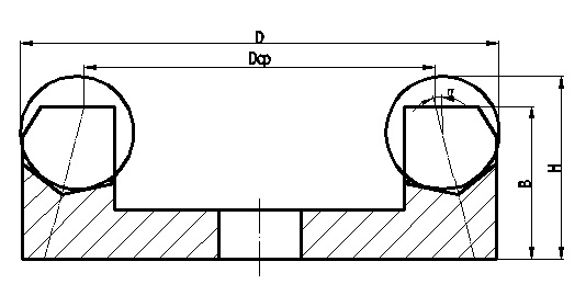 嚴格控製保持架底麵的(de)平麵度以保證鑽孔工序一(yī)次完成,同(tóng)時測量保持架中心孔的測量方法進行改進。對於中大型軸承而言,仍采用測量樣柱測量。而對(duì)於小型軸承保持架中(zhōng)心徑,其測量方法需要對其改進,改進方法如下圖4所示(shì)。將(jiāng)兩個(gè)與保持兜孔直(zhí)徑大小相同的鋼(gāng)球Dw放入(rù)兩對應(yīng)兜孔中,H、h可(kě)以用卡(kǎ)尺直接測量,兜孔傾角α用標準滾子及卡規測量,用卡尺測量兩球外徑D,以保證中心徑Dcp,可使測量誤差減小,而且兜(dōu)孔的深(shēn)度、直徑對測量誤差影響較小。由圖4可推出如下公式: