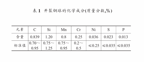 從鋼球上線切割取樣,磨光後(hòu)經直讀光譜分析其成分,結果見表1。冶金行業規(guī)定的化學成分(fèn)標準[2]見表1,可見鋼球化學成分符合要求。