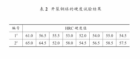 用洛氏硬度試驗機從(cóng)兩個不同方向,分別標記為1#和2#。由於Z外表麵的硬(yìng)度無法測(cè)量,因此從距外表麵10mm處作為個測量點,每隔10mm測量開裂鋼球從表麵至近心部的洛氏硬度,結果見表2。個方向從表(biǎo)麵至心部約20mm處出現硬度降低;第二(èr)個(gè)方向在30mm處出現硬度降低。從(cóng)硬度結果可以看出,鋼球在(zài)每(měi)邊的淬硬深度不相同,說明淬火過程中冷速不均勻。