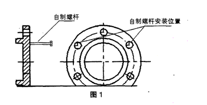 天(tiān)輪是礦井提升係統的核心組成部分,對(duì)安全提升起著至(zhì)關重要的作用。主井天輪軸承的檢查及定(dìng)期換油是提升係統檢修的重要環節,天(tiān)輪軸(zhóu)承檢查或(huò)更換油脂時需要(yào)把軸承(chéng)內外端蓋打開,但由於軸承端蓋較大,且重量較重,在把軸承端(duān)蓋打開後為了保證檢查或換油後軸承端蓋能更好保持原位(wèi)安裝,我們通常是在軸承(chéng)端蓋的上半部固定孔對稱位置加裝2個(gè)自製(zhì)的加長螺杆來給軸承端蓋(gài)導向並(bìng)且可以讓端蓋可以沿螺杆的方向向外推(tuī)開,保證檢修的空間同時又將端蓋進行了反留。如圖1所示。