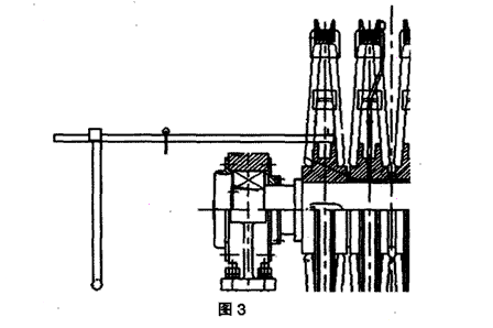 筆者設計(jì)了一個天輪檢(jiǎn)修(xiū)支架,支架為可移動組裝式(shì),分為可移動式三角支(zhī)架腿,一頭帶限位裝(zhuāng)置的起吊(diào)橫(héng)梁,跑車式(shì)起吊裝置三部分。如圖2所示。