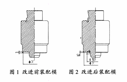 改進前的防塵蓋裝配模在工作時,φD1的平麵壓在內套端麵上,模具(jù)靠內套端麵限(xiàn)位,此時,模具不再(zài)向下移動,也就是說,當由(yóu)於某種原因導致防塵蓋變形而(ér)出(chū)現“蓋高”現象時,φD1的平麵不能把(bǎ)高點壓平,使之(zhī)低於軸承套圈的端麵。